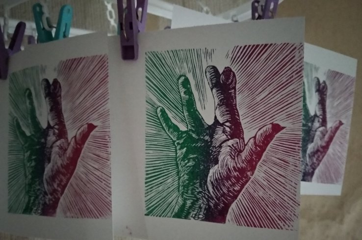 A small print (A6 postcard) that involved a lot of cutting. The background wasn’t planned but cutting lines into lino gets quite mesmerising.