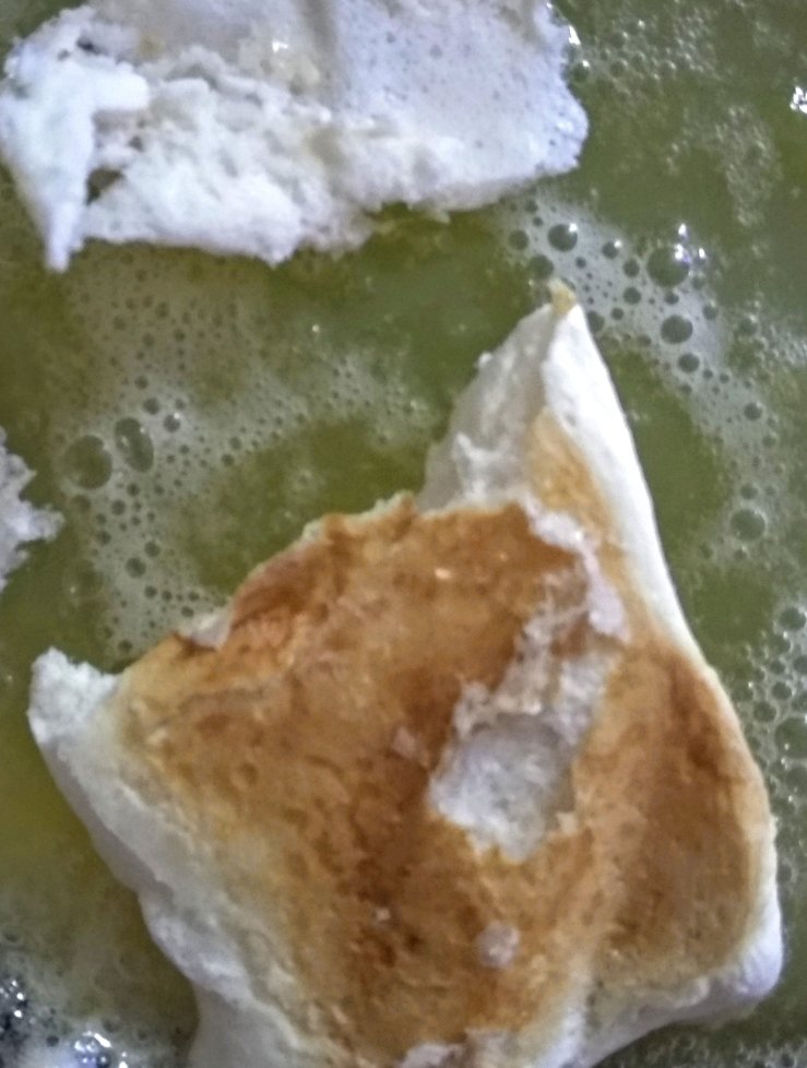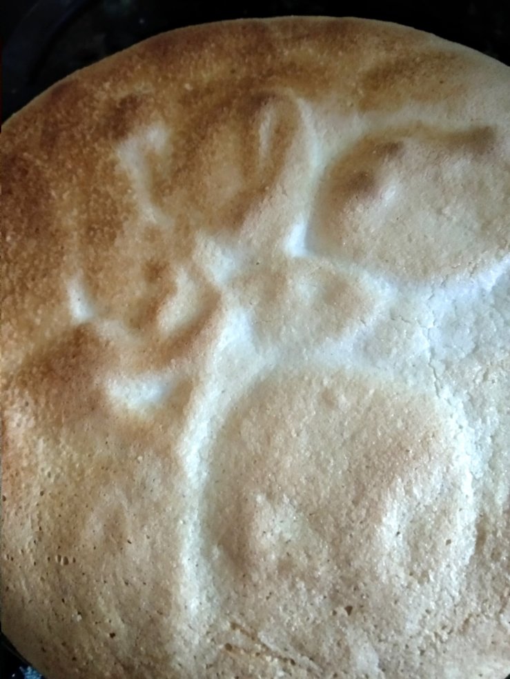 The meringue on top of the pie was also watery inside. Grilling it didn’t help. Neither did microwaving, it exploded! I gathered the broken pieces and microwaved them. Lemon pie with chickpea meringue garnish?