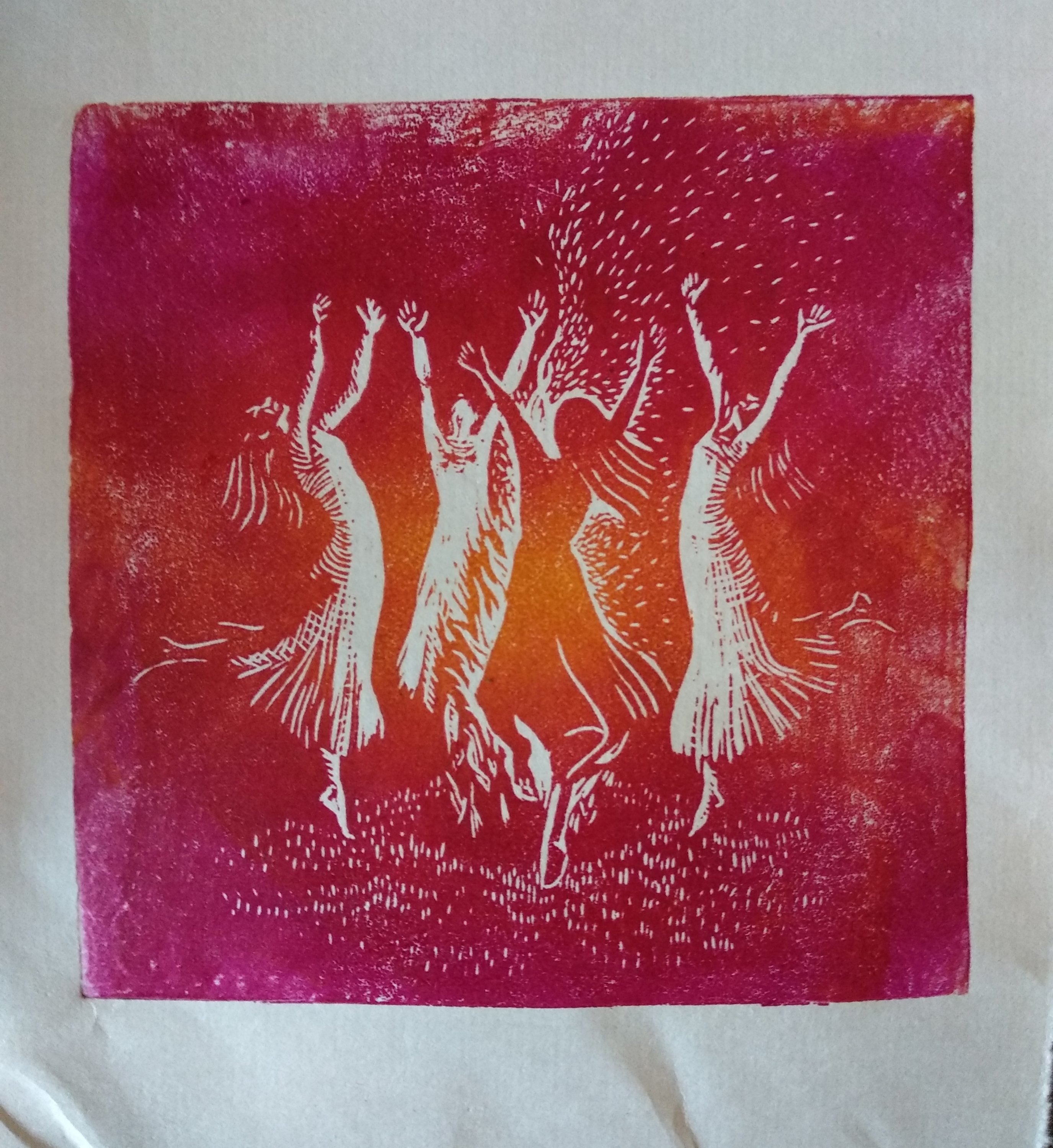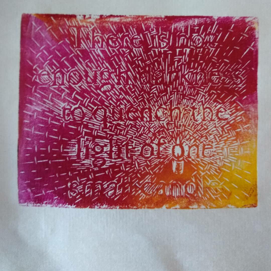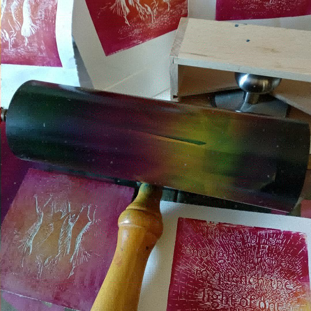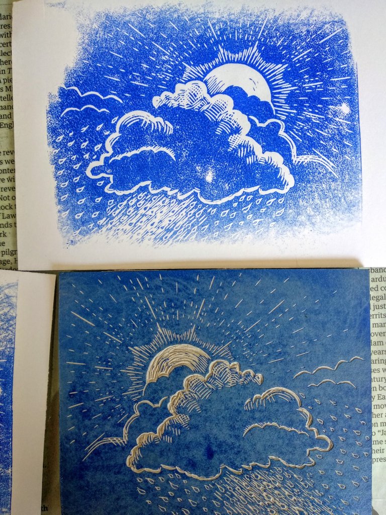 A couple of printing sessions that were more chaotic than usual. Missing pliers meant that I couldn’t get the lid off a blue ink tube. Some leftover black from the previous day seemed a good option. Later, I found another foil-wrapped leftover, a mixture of blue and white.