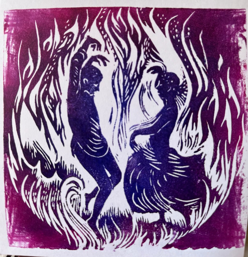 Linocut of some dancers, based on photos I took in Glastonbury. They will be printed in red and yellow for next midsummer.