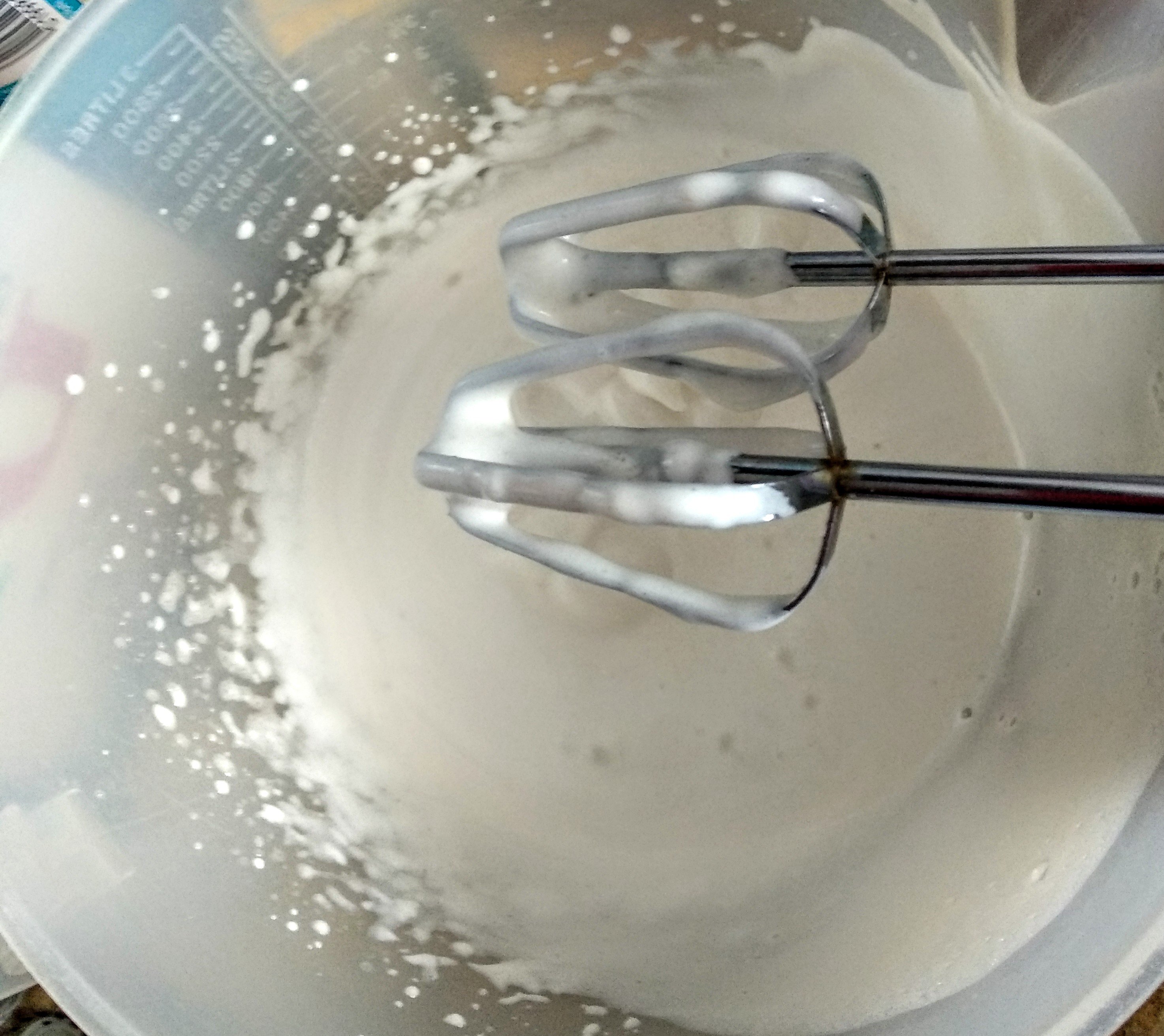 There was a jar of water left over from a can of chickpeas. I whisked the water with half a teaspoon of cream of tartar. I added caster sugar and continued to whisk.
