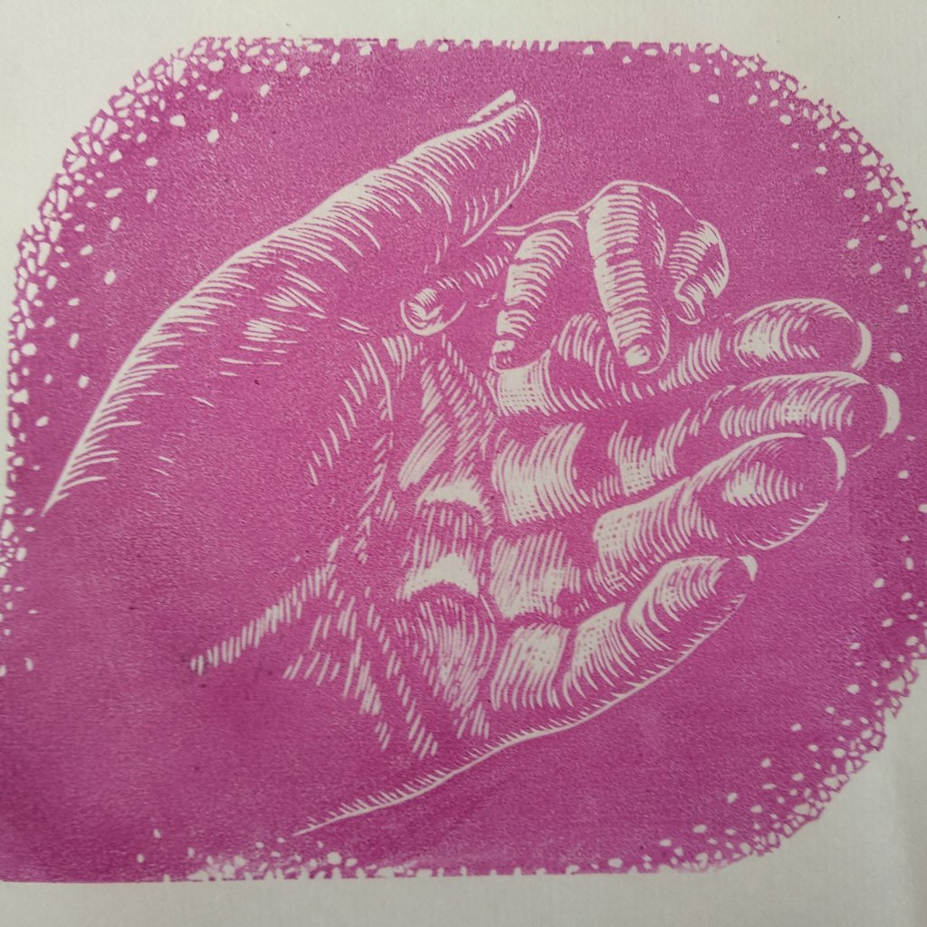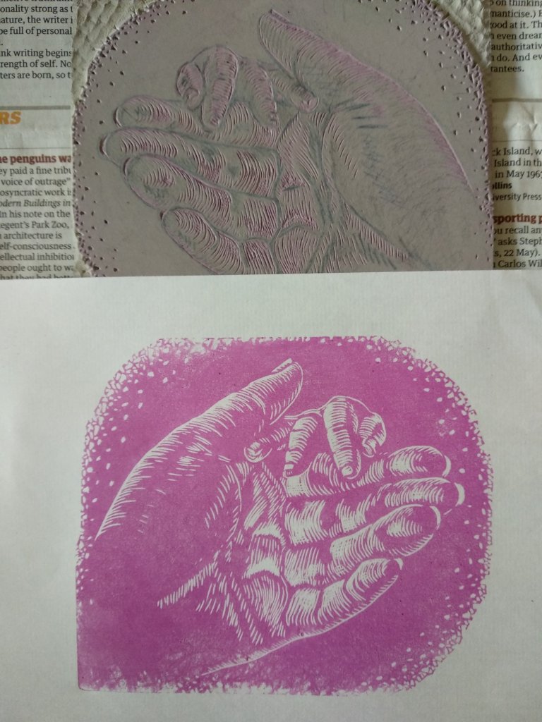 Twenty five years ago I took a few photos of my firstborn’s hand on my hand. Since then I’ve made drawings from the least blurry pictures, and transferred one of those to a little piece of lino. Sketches and lino blocks go missing during house moves and home improvement projects.