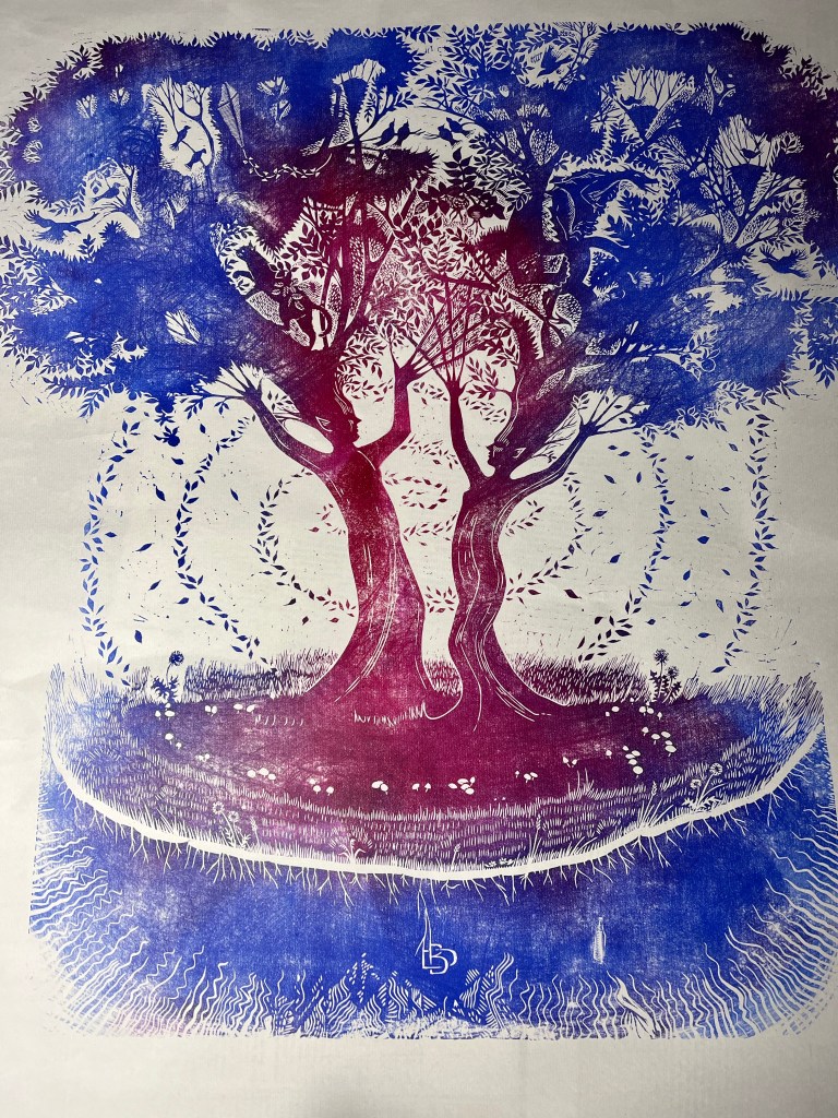 Linocut test print. Two human shaped trees with a spiral of leaves.