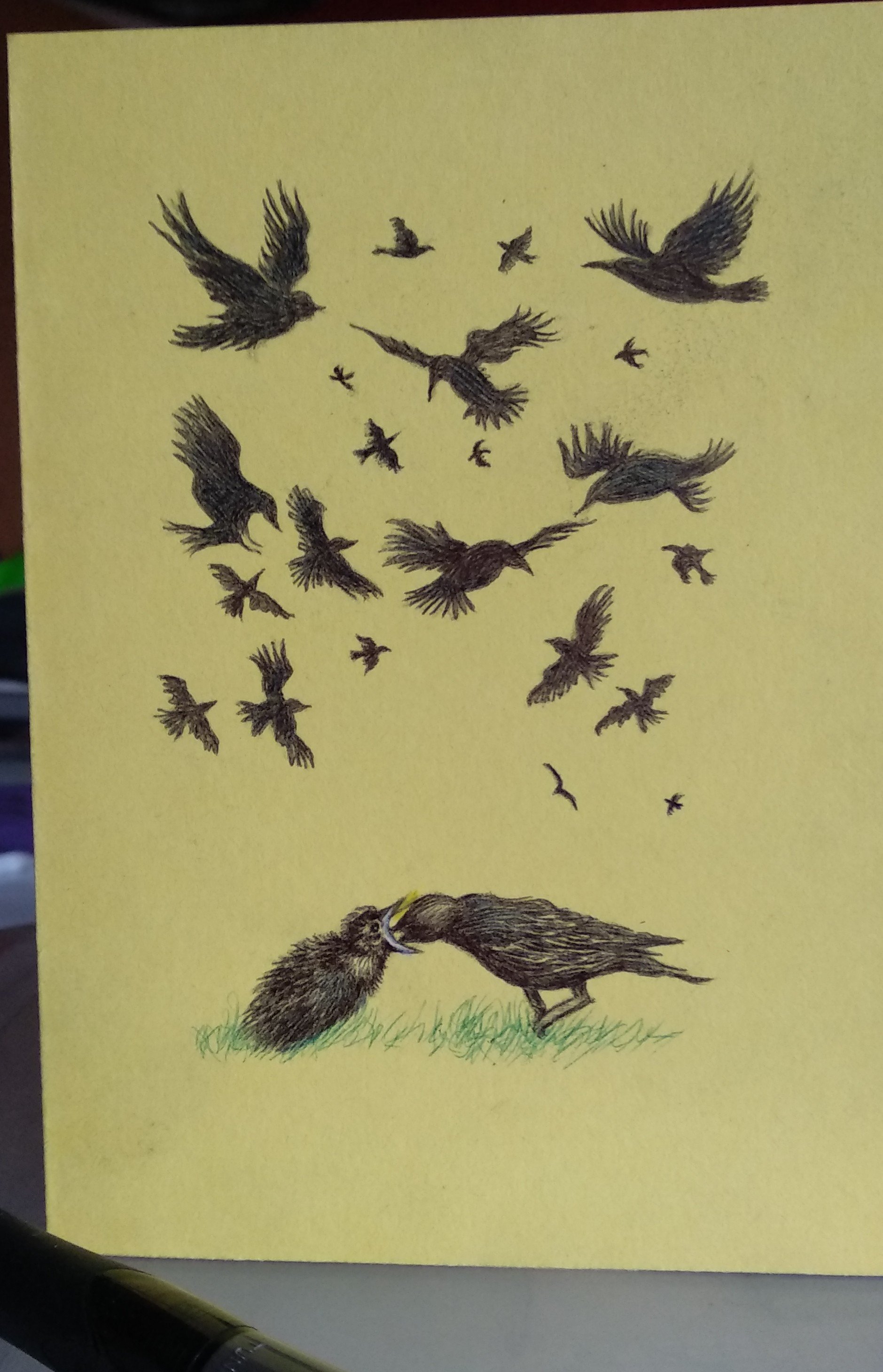 Recent drawings on greetings cards for various life events. Mixed media, Bic Cristal biro (black and green) with watercolour crayons. The cat sitting on a hill is near some wild garlic, which has been given darker green foliage since the photo was taken. I wondered why Ramsbottom is called that, or which other names were considered at that meeting. A bit of etymological reading suggested ransoms and the bottom of a hill. Wild garlic valley, obviously.