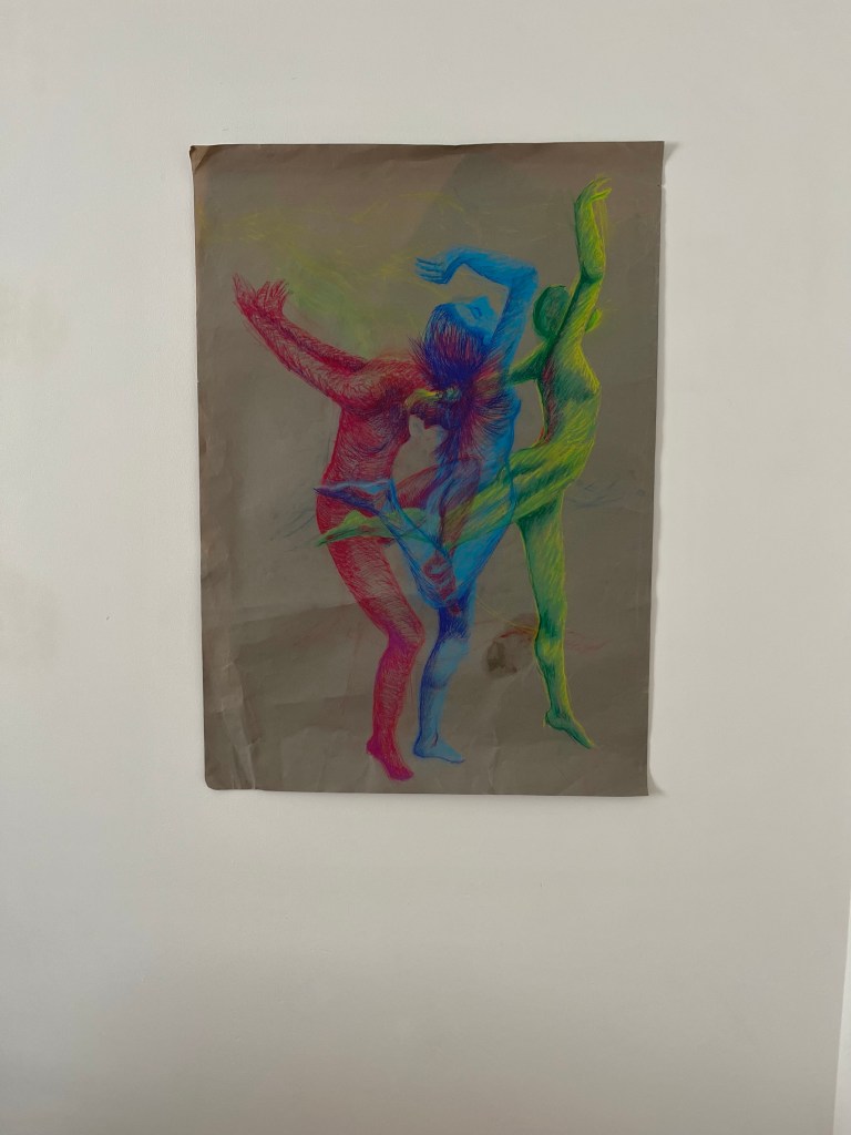 This is a little drawing, about 9 x 12cm. Various colours of biro and caran d’ache crayons.