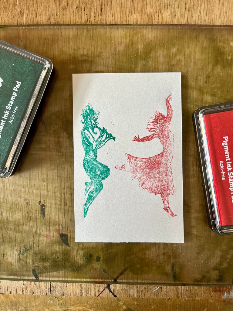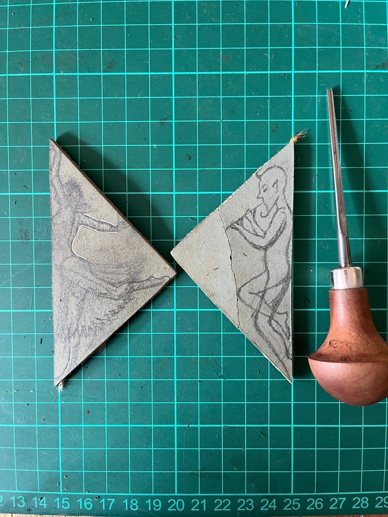 I found two offcuts from the corners of a previous linocut. Some little sketches could be tweaked to fit. The test print with an ink pad on a postcard shows there are some angles that need curving.