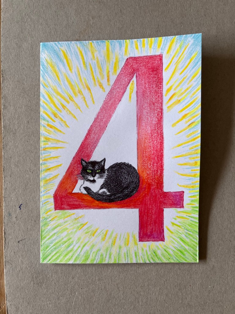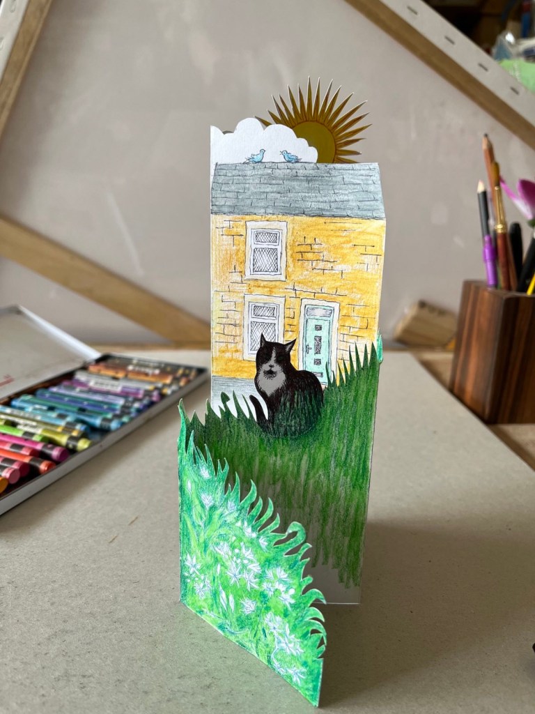 Recent drawings on greetings cards for various life events. Mixed media, Bic Cristal biro (black and green) with watercolour crayons. The cat sitting on a hill is near some wild garlic, which has been given darker green foliage since the photo was taken. I wondered why Ramsbottom is called that, or which other names were considered at that meeting. A bit of etymological reading suggested ransoms and the bottom of a hill. Wild garlic valley, obviously.