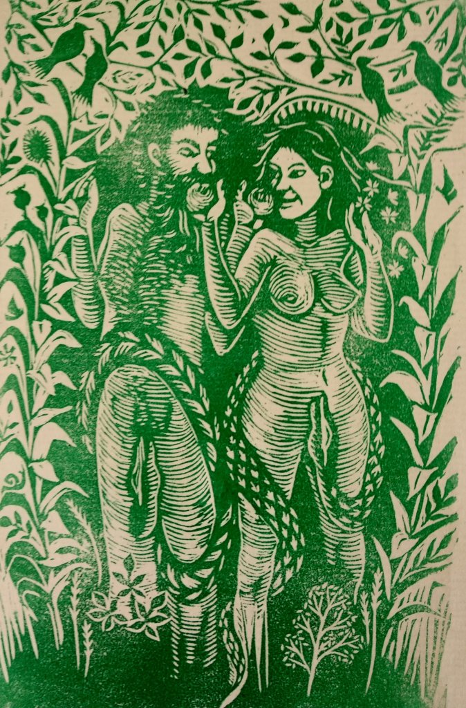 The image is inspired by Adam and Eve’s carving on the west front of Lincoln cathedral, not far from the mouth of hell. My Lincoln ancestors were stonemasons.